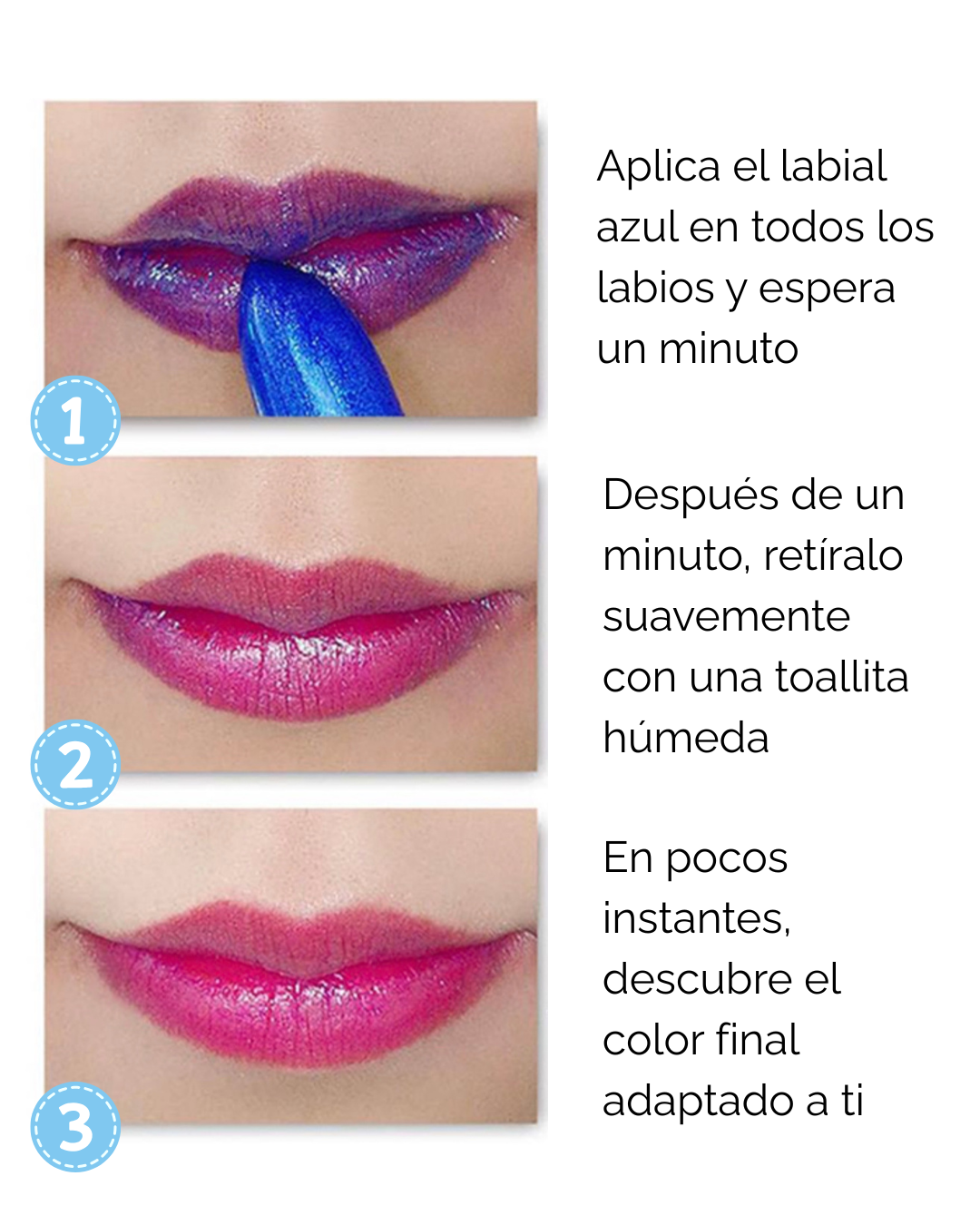 - Espera 2-3 minutos y limpia con un pañuelo húmedo para descubrir la magia del cambio de color.