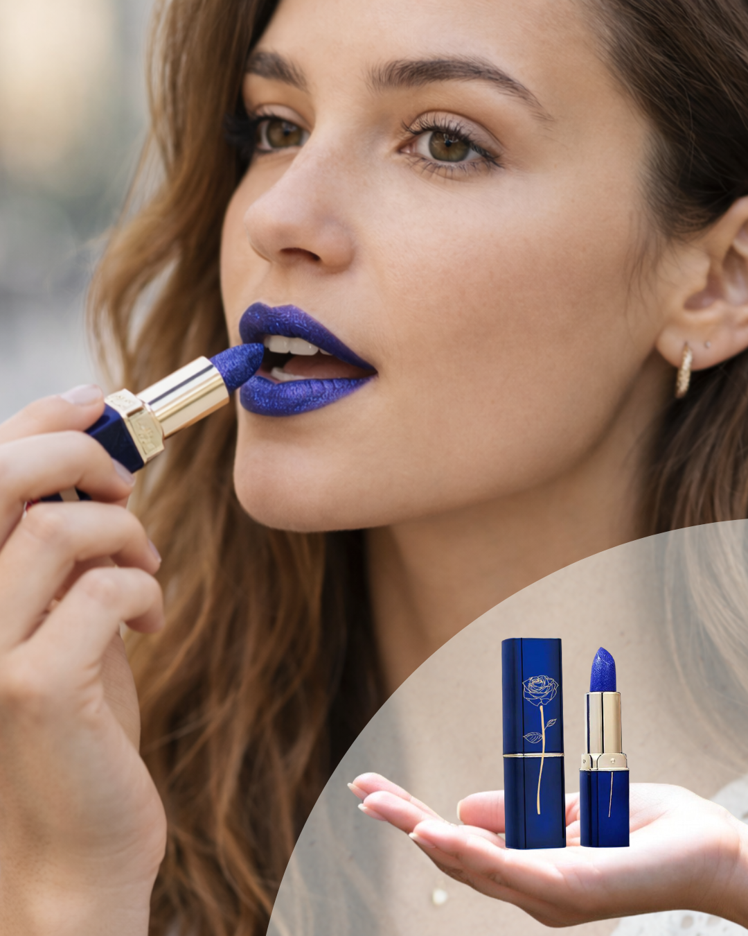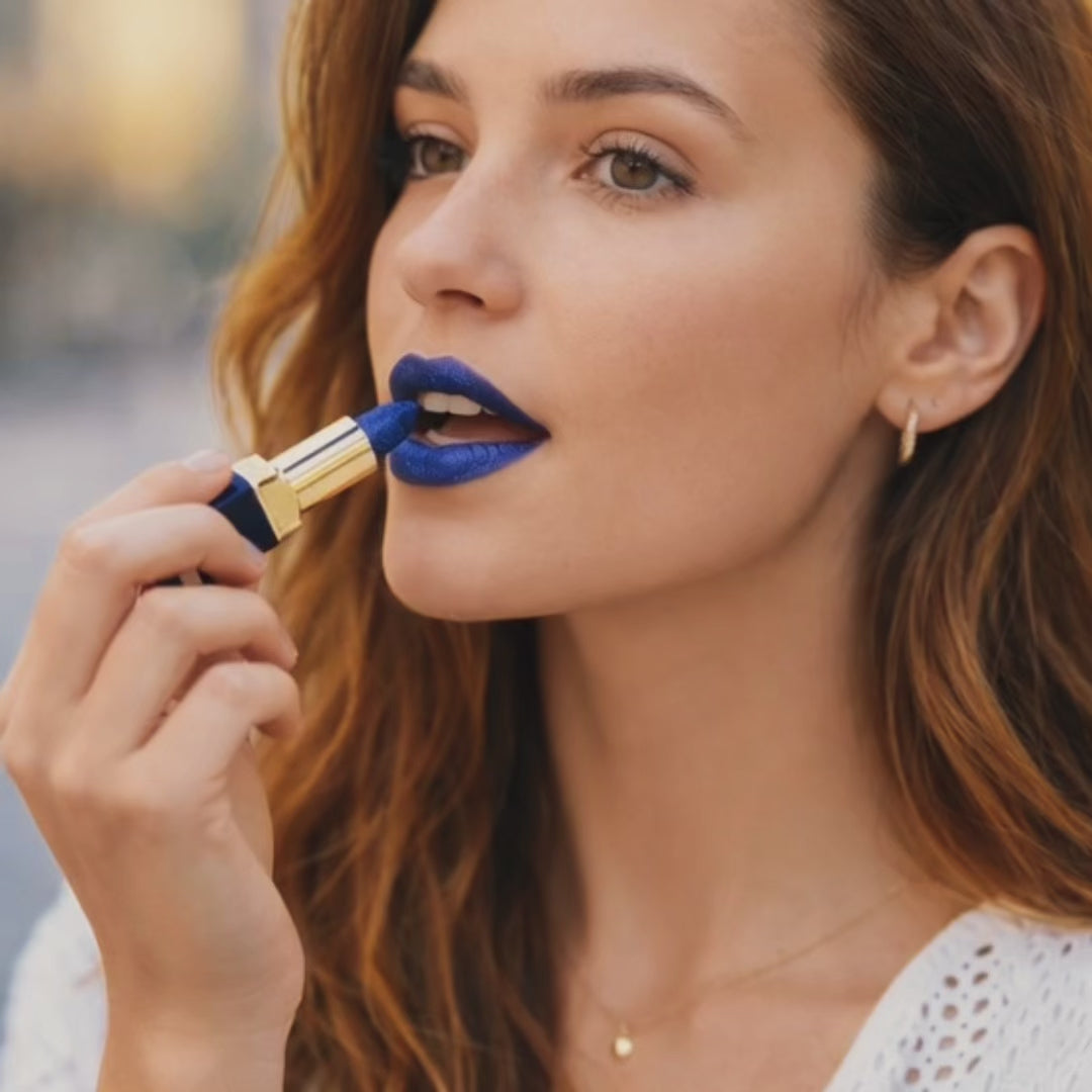- Aplica el labial y siente cómo tu sonrisa cobra vida con un primer toque azul.