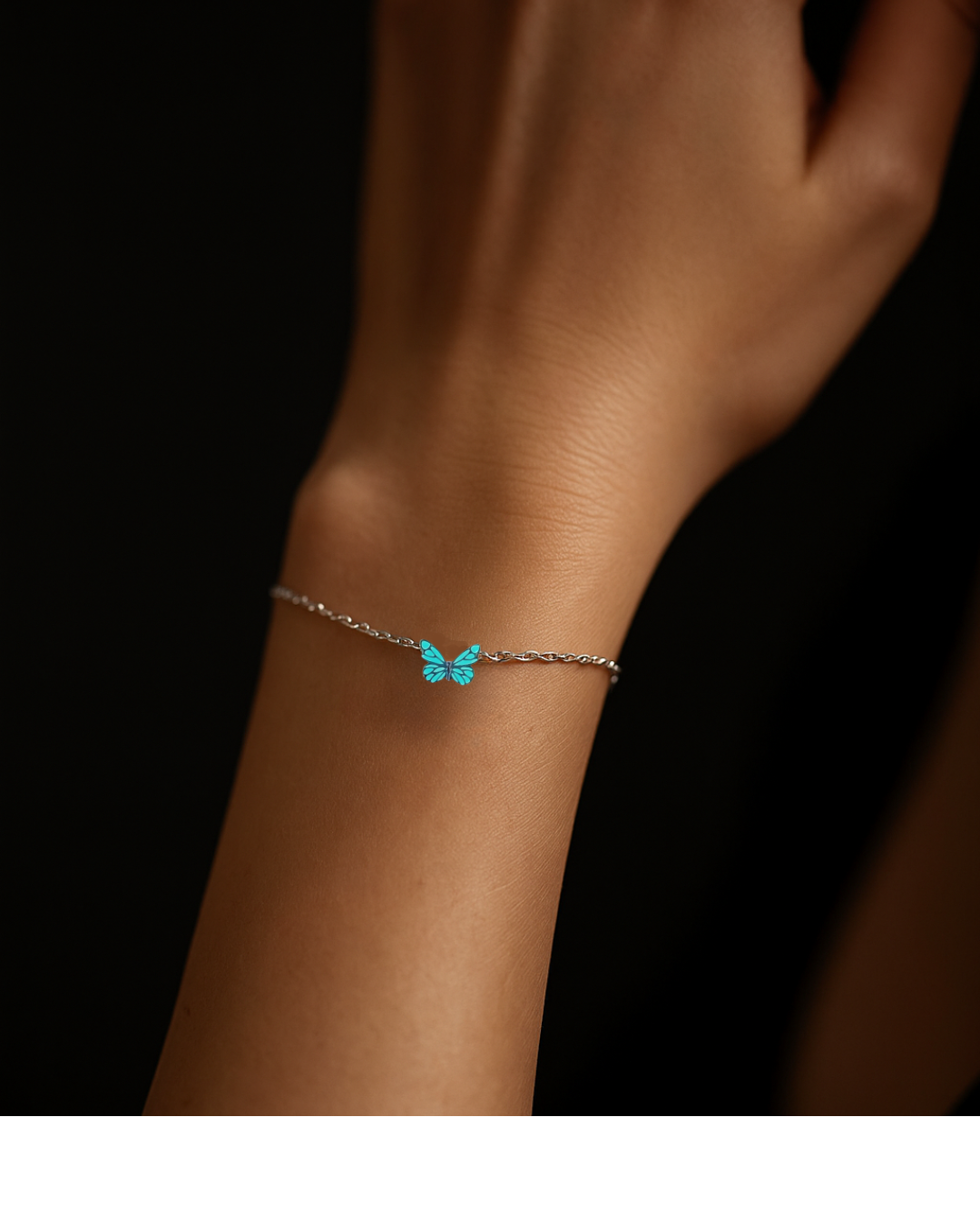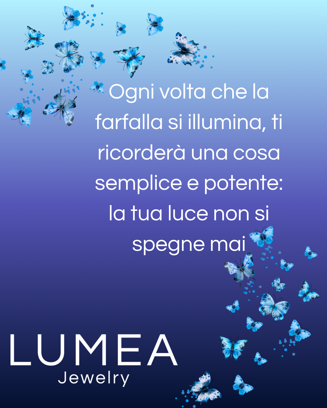 Un duo di gioielli pensato per chi ama i dettagli che sorprendono. Ogni ciondolo è finemente modellato a forma di farfalla e riempito con un materiale luminescente sicuro che assorbe la luce naturale o artificiale e la rilascia lentamente al buio, creando un bagliore soffuso e romantico.